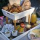 Maak de bladerdeeghapjes warm in de oven 175C. Plaats daar op het laatste moment ook de scone bij. Plaats alle gerechten op een etagère, zorg voor voldoende thee in verschillende soorten. Een mooi ingedekte tafel maakt extra sfeer.
